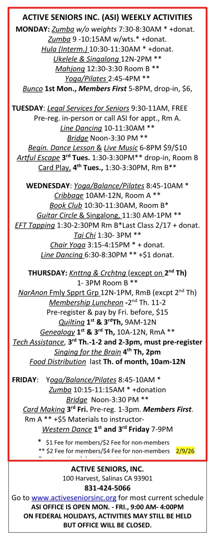 Active Seniors, Inc. exists to provide a friendly and secure environment primarily for senior citizens giving them the opportunity to participate in a variety of activities which may be physically, mentally and socially healthful according to their individual needs. The Corporation exists to serve interested residents of Monterey County.
