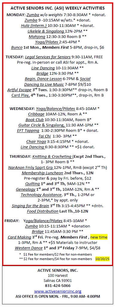 Active Seniors, Inc. exists to provide a friendly and secure environment primarily for senior citizens giving them the opportunity to participate in a variety of activities which may be physically, mentally and socially healthful according to their individual needs. The Corporation exists to serve interested residents of Monterey County. Monterey County.