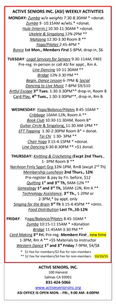 Active Seniors, Inc. exists to provide a friendly and secure environment primarily for senior citizens giving them the opportunity to participate in a variety of activities which may be physically, mentally and socially healthful according to their individual needs. The Corporation exists to serve interested residents of Monterey County. Monterey County.
